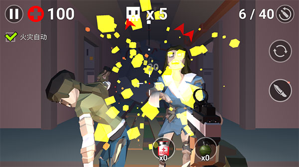 总结:熟悉基础操作后,可结合界面功能进一步提升战斗效率。如图所示,从左至右依次为自动射击开关、骷髅头图标显示当前僵尸数量,右侧设有装弹、切换武器及近战刀击按钮;屏幕下方则展示医药包、手榴弹等关键道具。