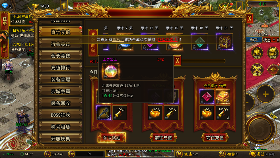 8、宝石:通过每日充值及累计充值奖励可获得极品宝石!参与“通天塔”活动还能产出随机宝石袋,开启后有机会获得稀有极品宝石!